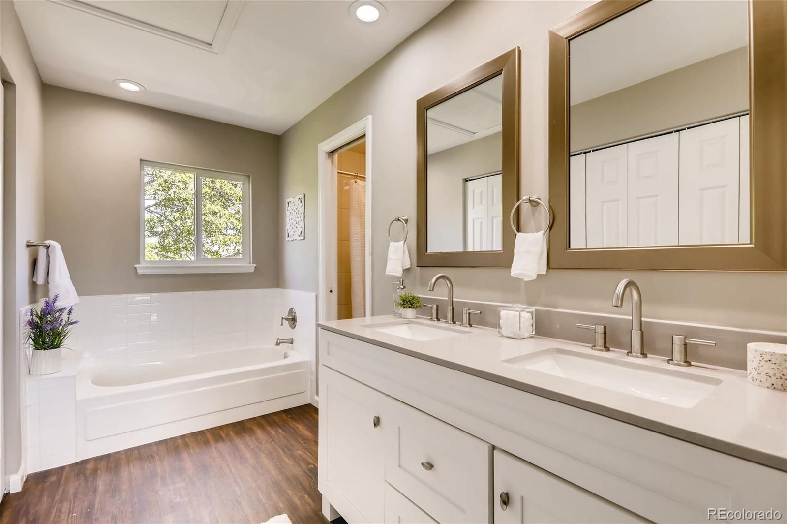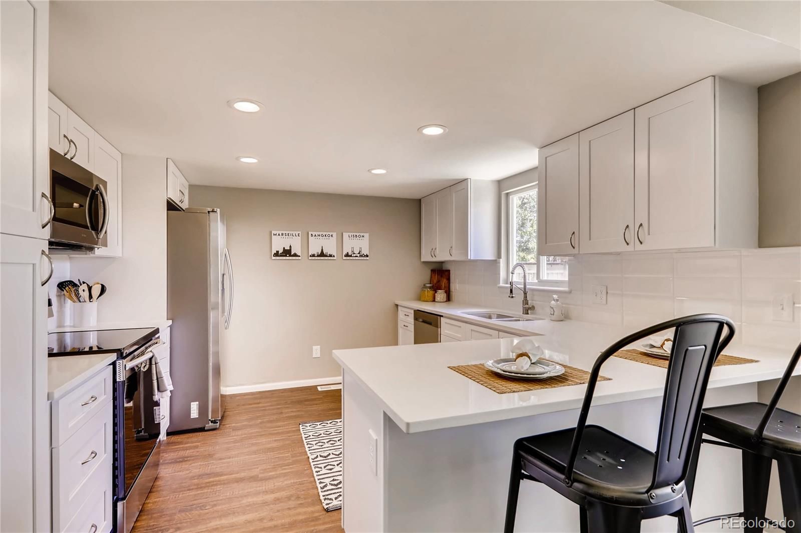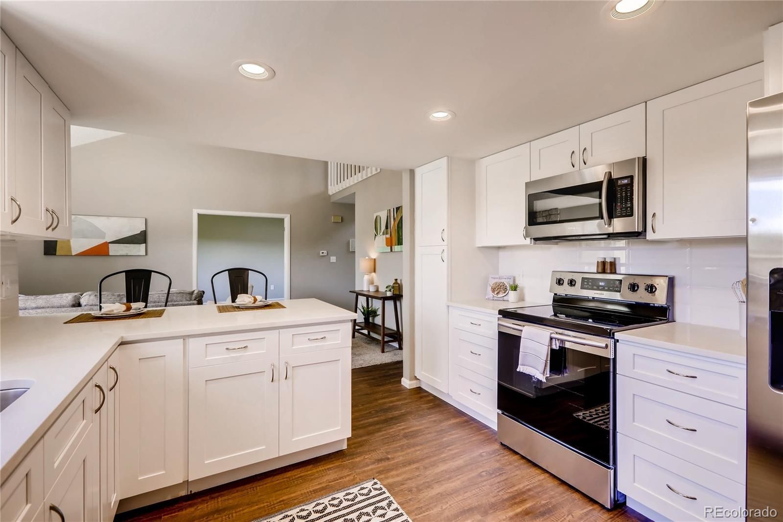 Come and see it! There is no better value for these finishes in the metro area. This cozy end-unit home features two oversized bedrooms. Brand new quartz countertops, new appliances, new cabinets, new lighting, newer windows, new carpet and flooring, and freshly painted! New water heater as well. Both bathrooms have been renovated from top to bottom, the master bathroom boasts a full bathtub and shower. Private garage parking included. It won't last long, so come have a look!